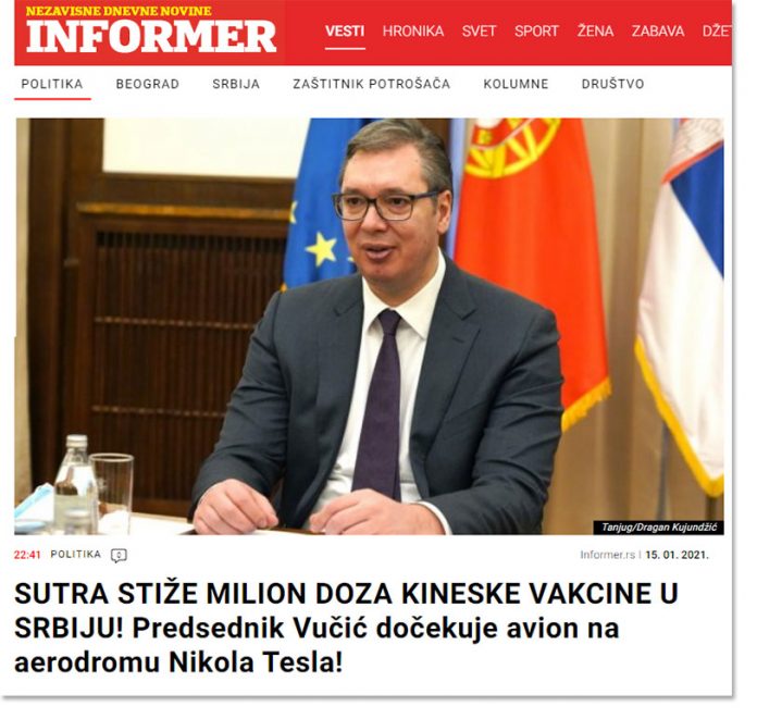Председник Србије Александар Вучић дочекаће сутра на аеродрому ”Никола Тесла” авион “Ер Србије” којим ће у Србију из Кине бити допремљено милион доза вакцине компаније ”Синофарм”.